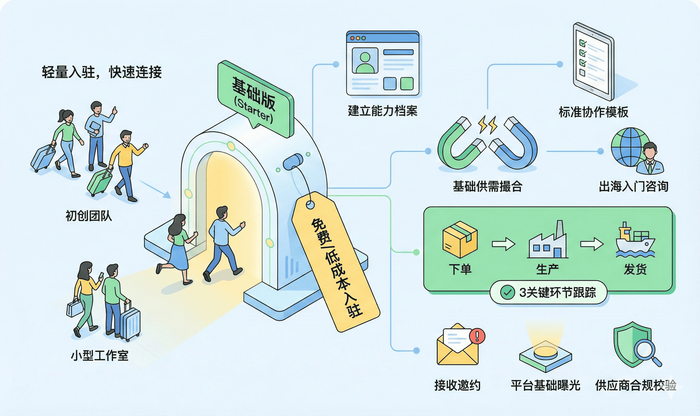 为满足不同规模、不同阶段的企业与工作室,我们提供三档服务套餐,覆盖从基础入驻到深度协同与供应链金融支持的全链路能力。平台通过数据驱动的匹配引擎、标准化云制造流程和严格的交付机制,帮助供需双方快速建立可靠合作。